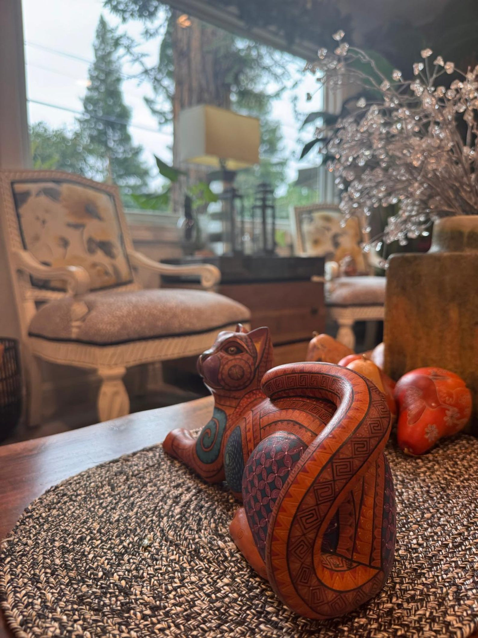 Alebrijes are shaped creations based on artist imaginations, dreams or fantasies. The hand carving process uses knives and machetes to shape the copal tree wood, with expert painters creating designs unique to each artist. They may be cleaned with a dry or wet cloth. San Martin Tilcajete is a community that concerns itself with the environment, and we reforest our raw materials such as the copal tree.
